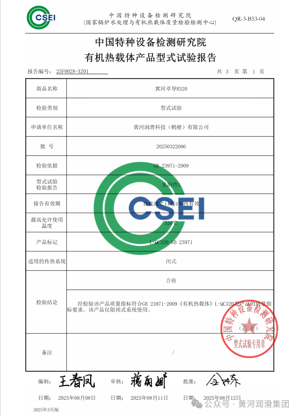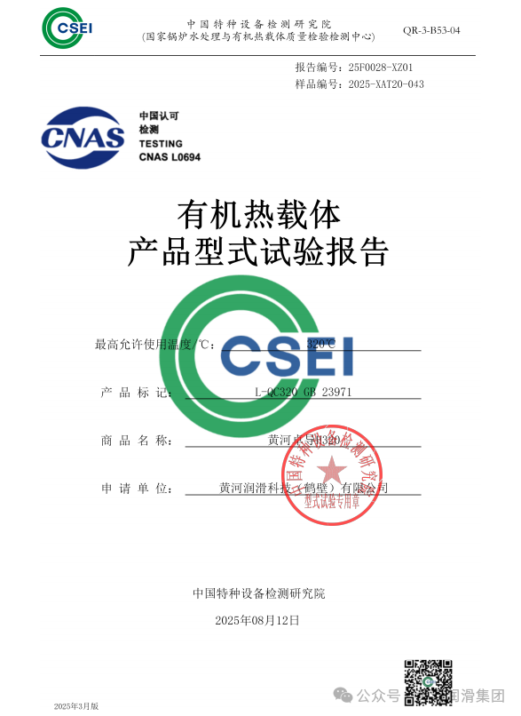 黄河润滑科技(鹤壁)有限公司导热油通过国家型式试验
